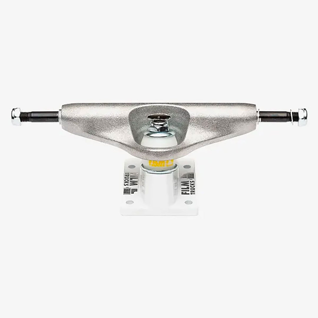 Film Trucks Raw - Soy Panday Signature trucks with white medium bushings, white baseplate and the yellow flying fish.