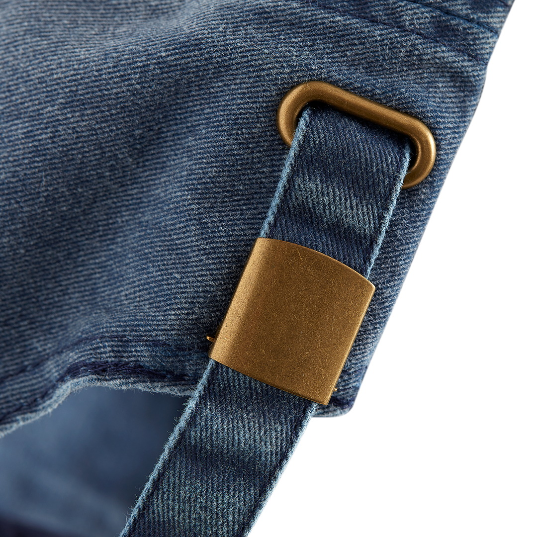 skateovation dad cap in the colour vintage denim with the SO logo embroidered in yellow. Vintage style. 100% brushed, washed cotton. The skateovation SO dad cap exists in four colours: vintage black, vintage olive, vintage denim and mustard. Features: Low-profile 6-panel design Soft, unstructured crown Ready-to-wear pre-curved peak Stitched ventilation eyelets Adjustable strap with brass-effect buckle
